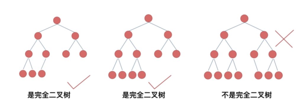 完全二叉树中,除了最底层节点没填满外(有额外条件!!),其余每层都达到节点数最大值,并且最下面一层的节点都集中在最左边若干位置(简单说就是在层序遍历的时候最后一层不会跳一个标数字,每个节点的序号都能和满二叉树时的序号对应上)。